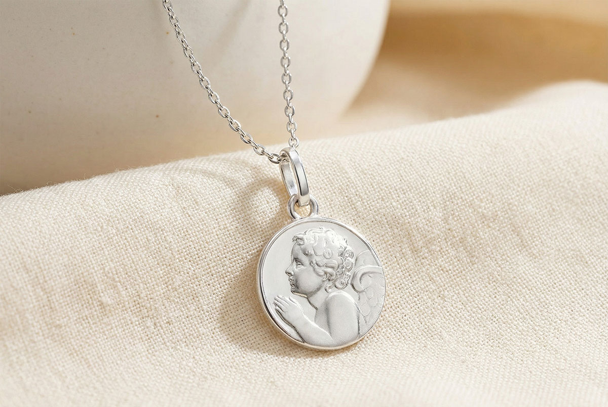 Reprezentujący modlącego się anioła, symbol czystości i ochrony, ten medalik uosabia wiarę i spokój.