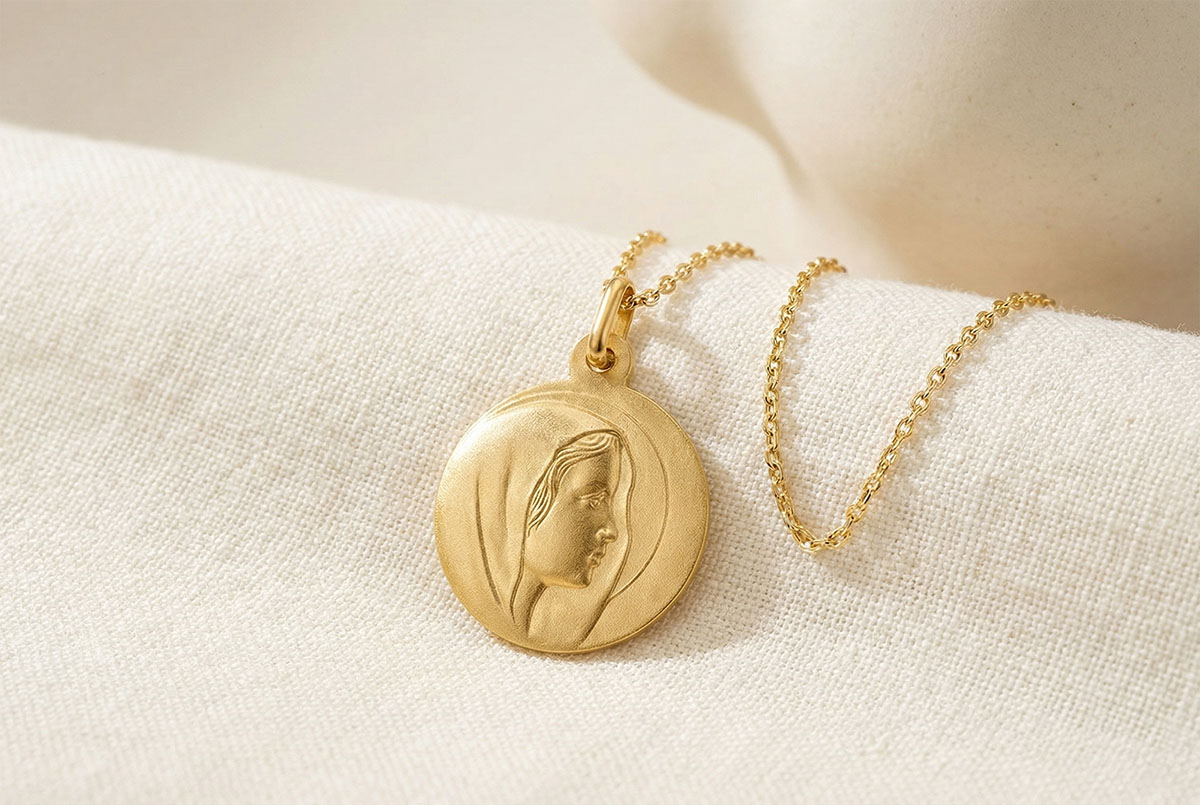 Ten żółtozłoty medalion ukazuje delikatny profil Matki Boskiej, wyrzeźbiony z elegancją i prostotą. Jej łagodne i spokojne spojrzenie, otoczone subtelnym halo, uosabia czystość i boską ochronę. Ponadczasowy klejnot, idealny na chrzest lub duchową okazję, symbolizujący wiarę, spokój i niebiańskie błogosławieństwo.