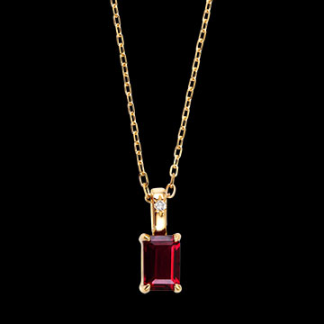 Ten naszyjnik z żółtego złota 9K prezentuje prostokątny, syntetyczny rubin o masie 0,8 ct.