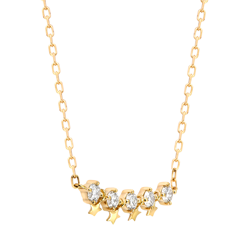 Pięć lśniących diamentów podkreślonych delikatnymi, złotymi gwiazdkami zawieszonymi z lekkością.Poetycka i pełna blasku biżuteria inspirowana rozgwieżdżonym niebem, aby rozświetlić każdą chwilę.