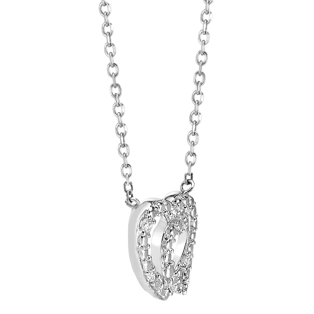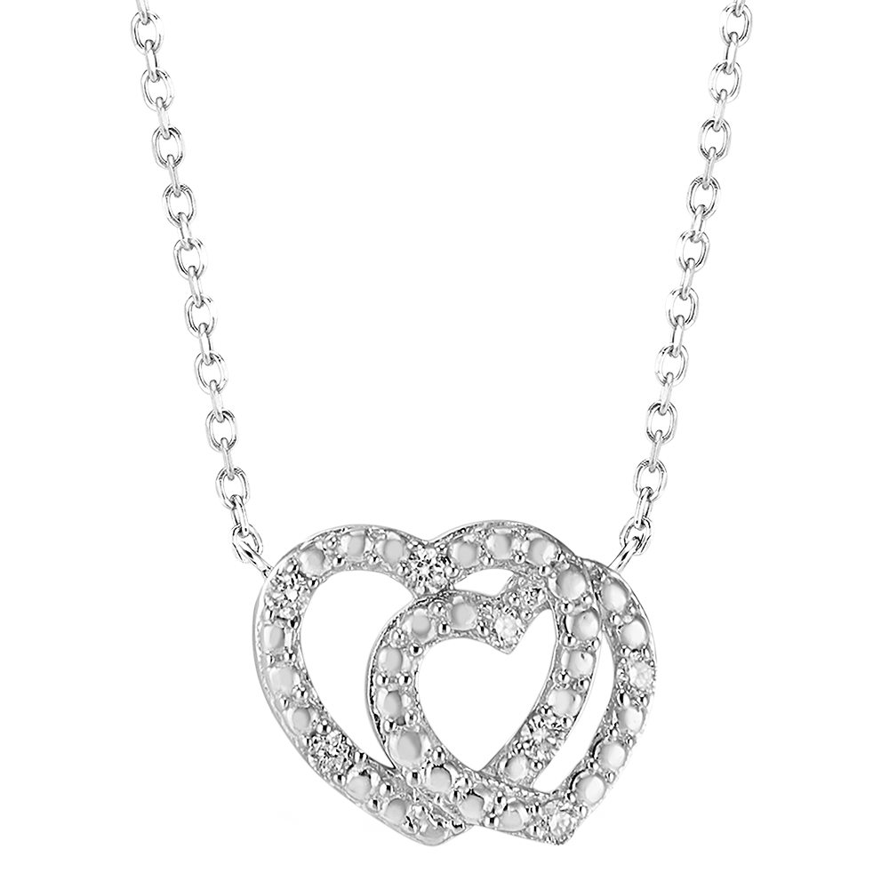 Naszyjnik, z dwoma złączonymi serduszkami z białego złota z wykończeniem imitującym diamenty oraz z inkrustacją z diamentów, przywodzi na myśl czułość i poczucie harmonii.