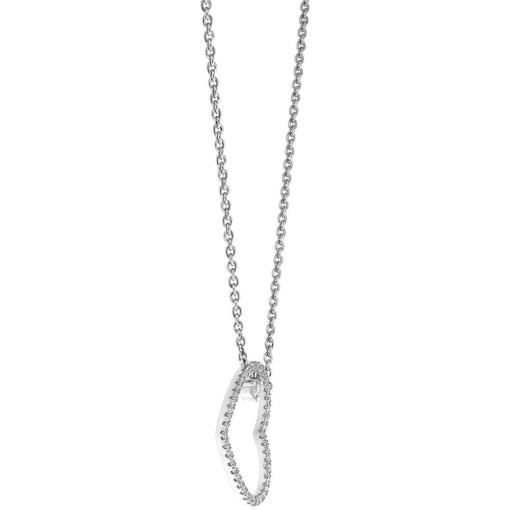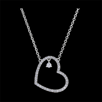 Delikatne serduszko z białego złota wysadzane brylantami, w którego centrum znajduje się diamentowy charms, który mieni się przy każdym ruchu naszyjnika. Z łańcuszkiem o długości 45cm i kółkiem do regulacji obwodu do 42cm.