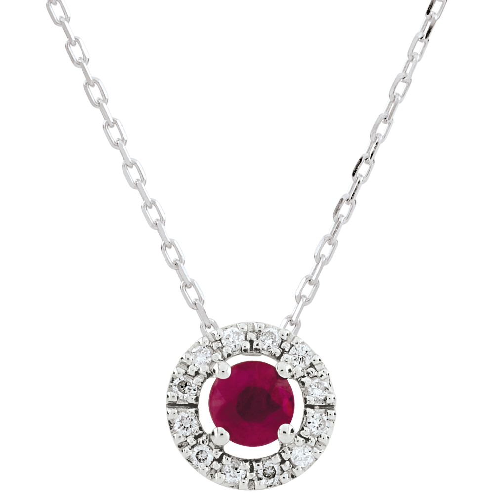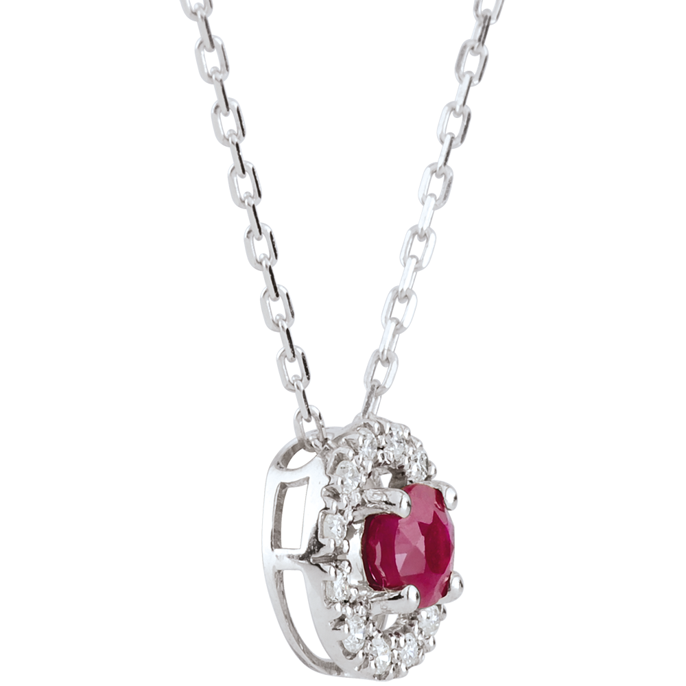Koło z białego złota wysadzane diamentem stanowi osłonę dla rubinu niczym gniazdo.
