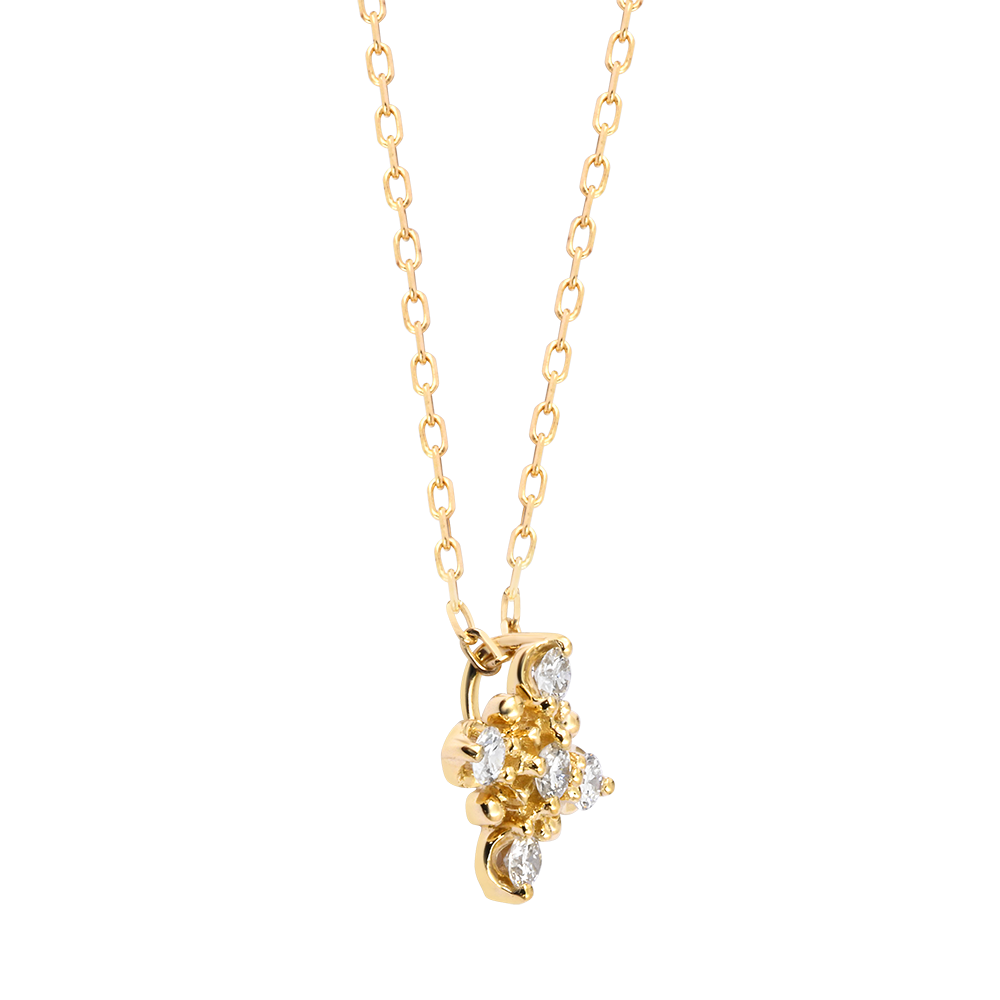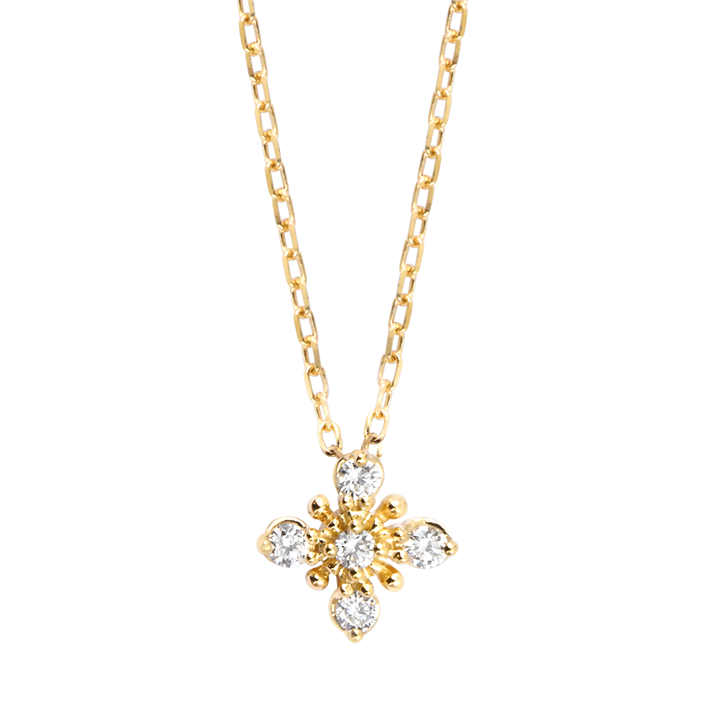 Pięć lśniących diamentów tworzy promienisty wzór, balansując pomiędzy gwiazdą a kwiatem.Biżuteria o wyrafinowanym blasku, symbol harmonii i światła.