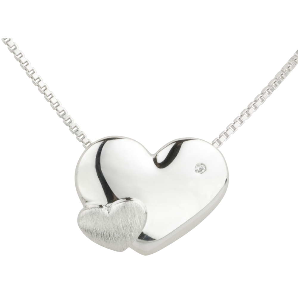 Małe serce z białego złota szczotkowanego jest umieszczone na błyszczącym sercu z diamentem.
