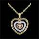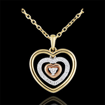 Trzy zwiewne, ruchome serca – jedno serce z żółtego złota, jedno serce wysadzane diamentami z diamentem środkowym oprawionym w trzy krapy, otoczone sercem z różowego złota.