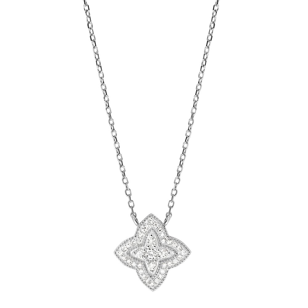 Ten naszyjnik łączy w sobie blask diamentów z designem inspirowanym kwiatami.