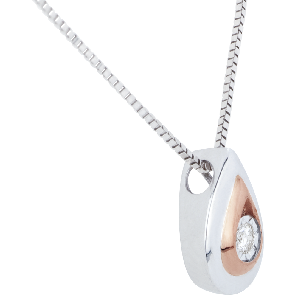 Delikatna łza z białego i różowego złota z błyszczącym diamentem na środku.