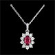 Owalny rubin stanowi środek margerytki z białego złotka z płatkami wysadzanymi diamentem.