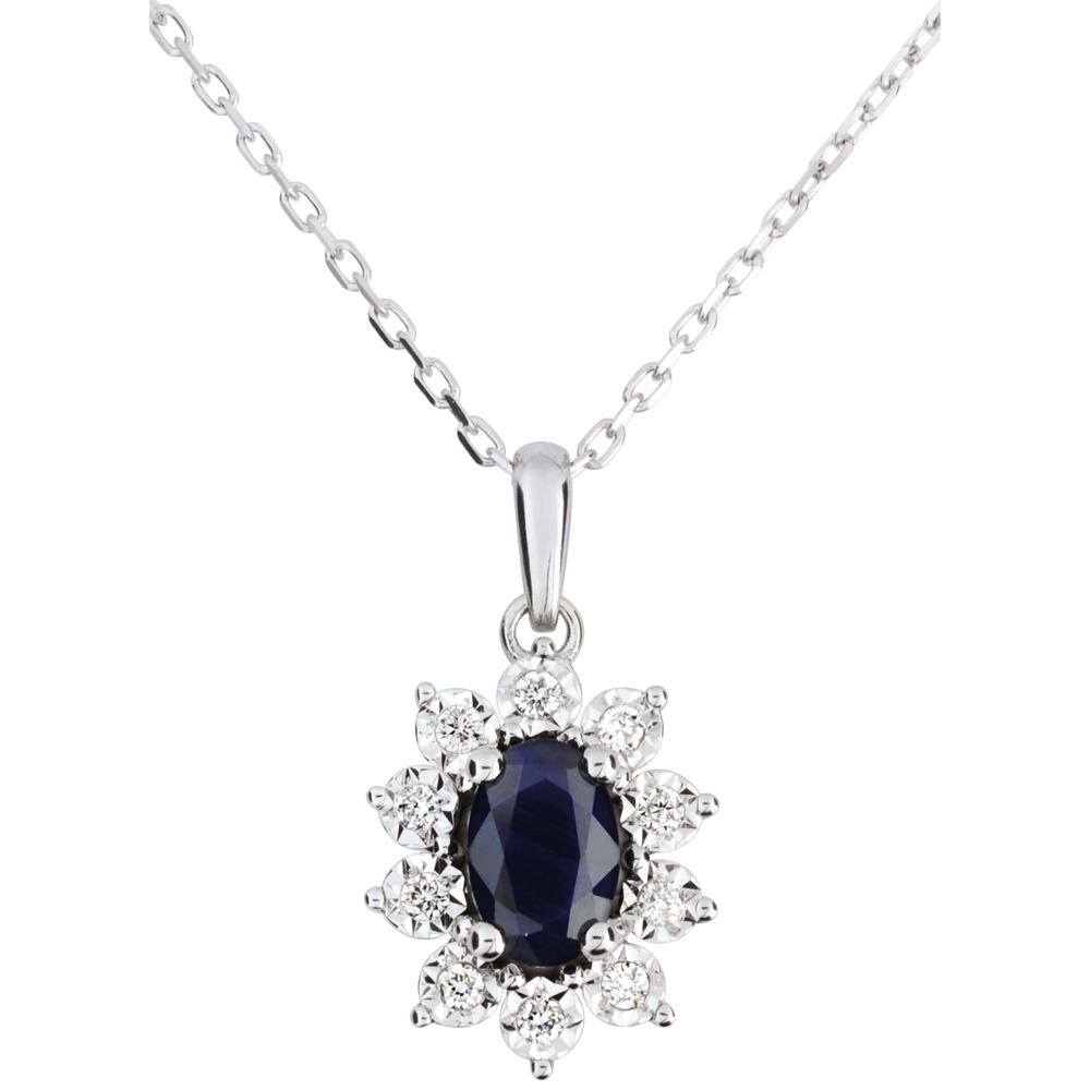 Owalny szafir stanowi środek margerytki z białego złotka z płatkami wysadzanymi diamentem.