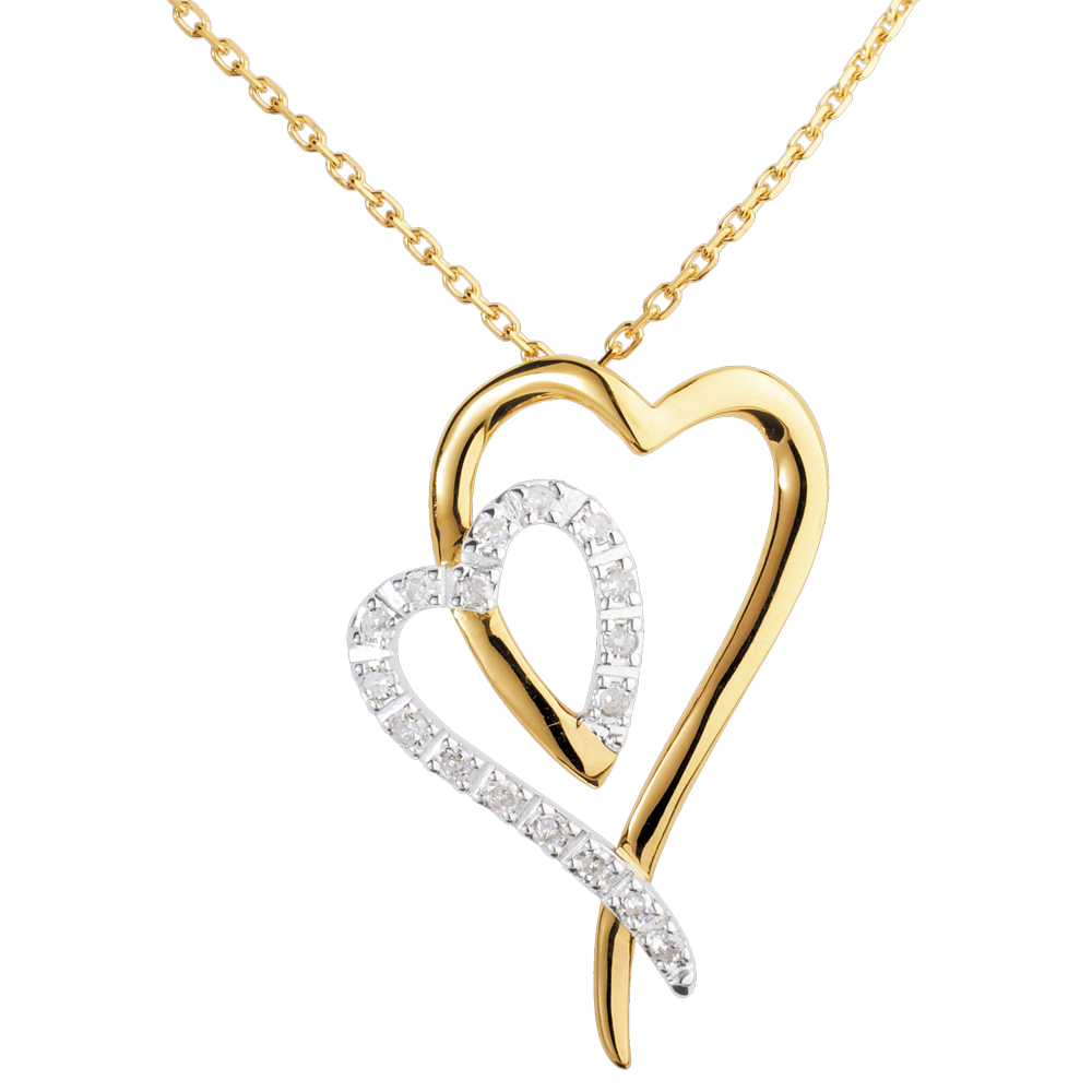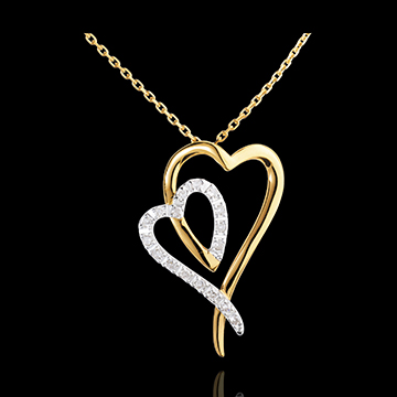 Naszyjnik w kształcie serc z żółtego i białego złota. Serce z białego złota subtelnie wysadzane diamentami.