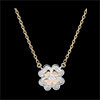 Nowoczesny naszyjnik z czterolistną koniczyną rozświetloną diamentem środkowym, o powierzchni wykonanej z polerowanego różowego złota, z motywami złotych kwiatów.