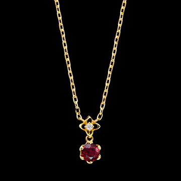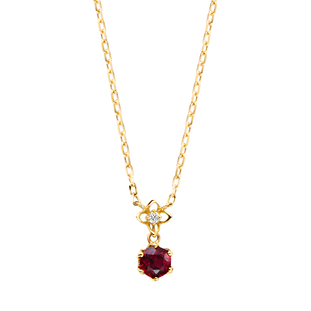 Ten naszyjnik z żółtego złota 9 karat prezentuje okrągły syntetyczny rubin o masie 0,2 karata zawieszony na delikatnym motywie kwiatowym, ozdobionym błyszczącym syntetycznym diamentem.