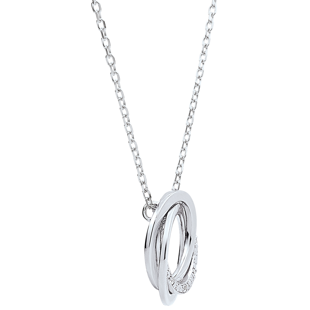 Naszyjnik stanowiący wyważone połączenie trzech pierścieni, podkreślonych diamentami osadzonymi w białym złocie.