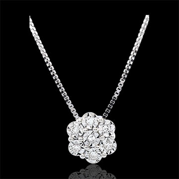 Płatek z białego złota, błyszczący przy każdym ruchu, wysadzany diamentami.