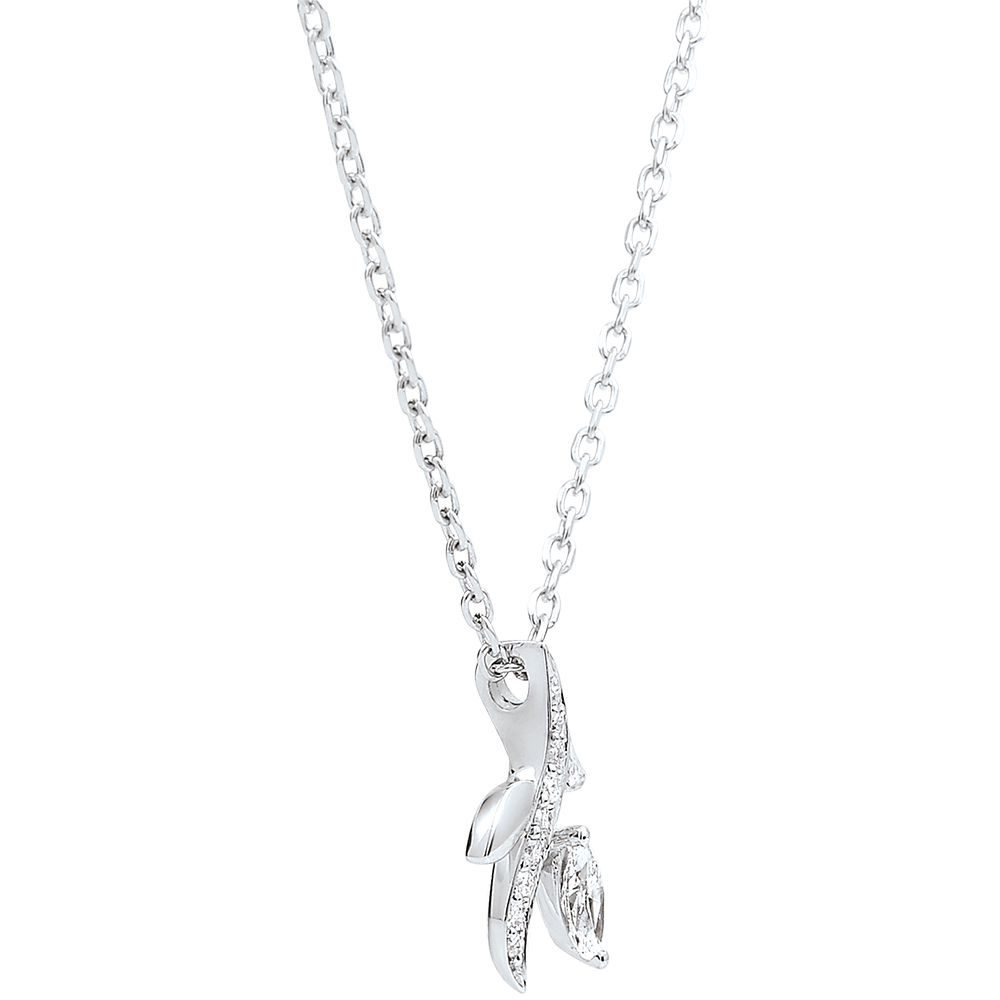 Błyszcząca gałąź utrwalona w ponadczasowej odsłonie. Jej kunsztowny liść, diamentowa łezka, jest podkreślony oprawą z białego złota wysadzanego brylantami.
