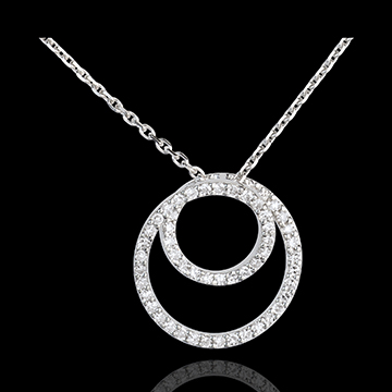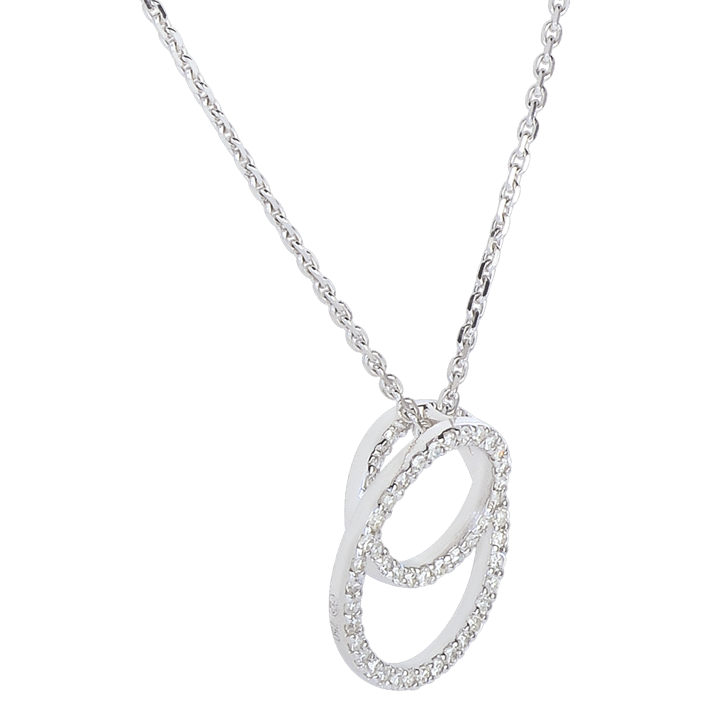 Doskonała krzywizna tworząca dwa koła z białego złota wysadzane diamentami.