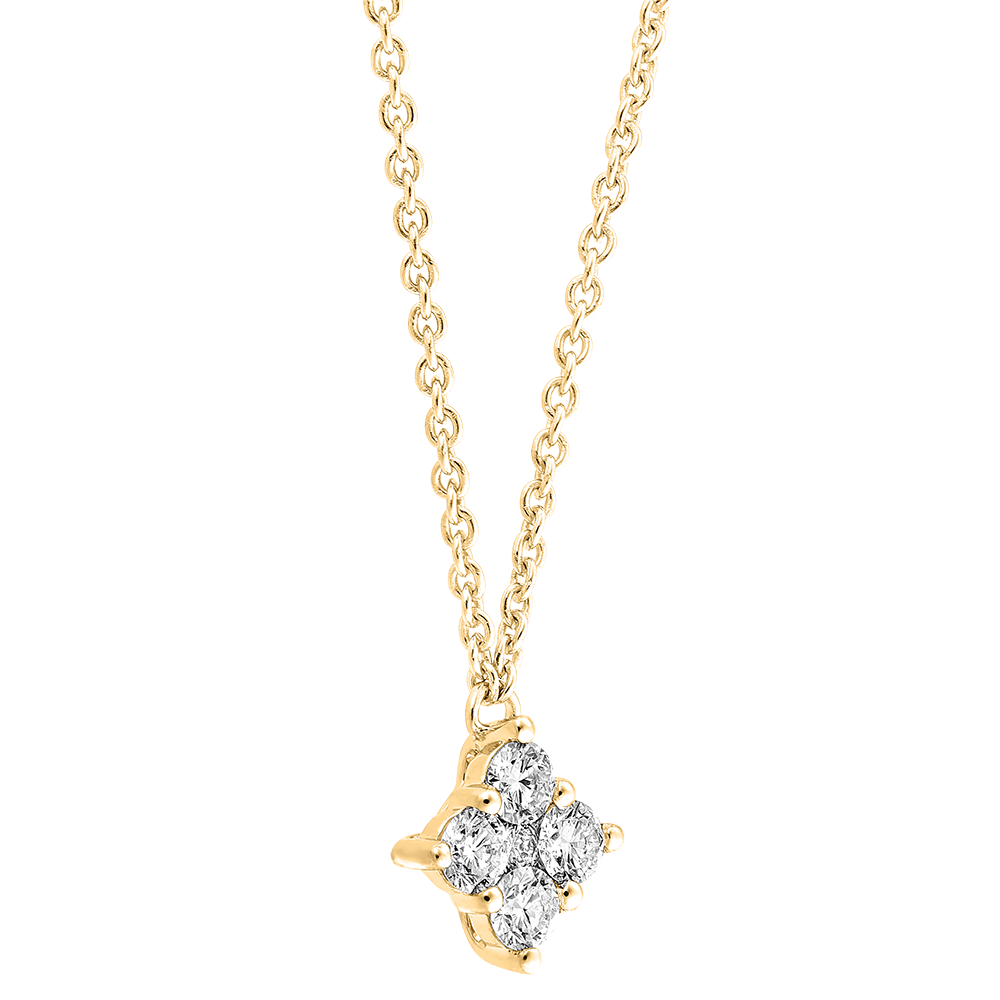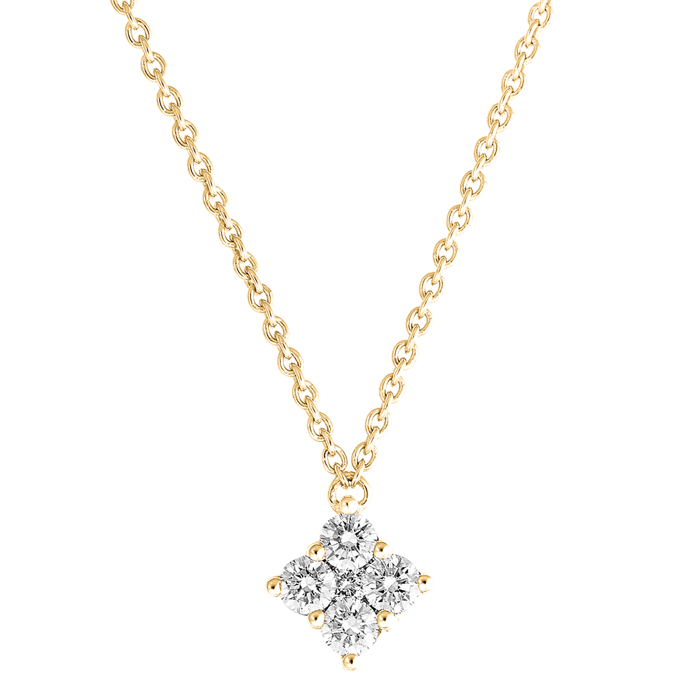 Naszyjnik z żółtego złota częściowo wysadzany diamentami z zawieszką inkrustowaną kwadratem z 5 diamentami, która nadaje szlachetny i nowoczesny akcent. Z łańcuszkiem o długości 45cm i kółkiem do regulacji obwodu do 42cm.