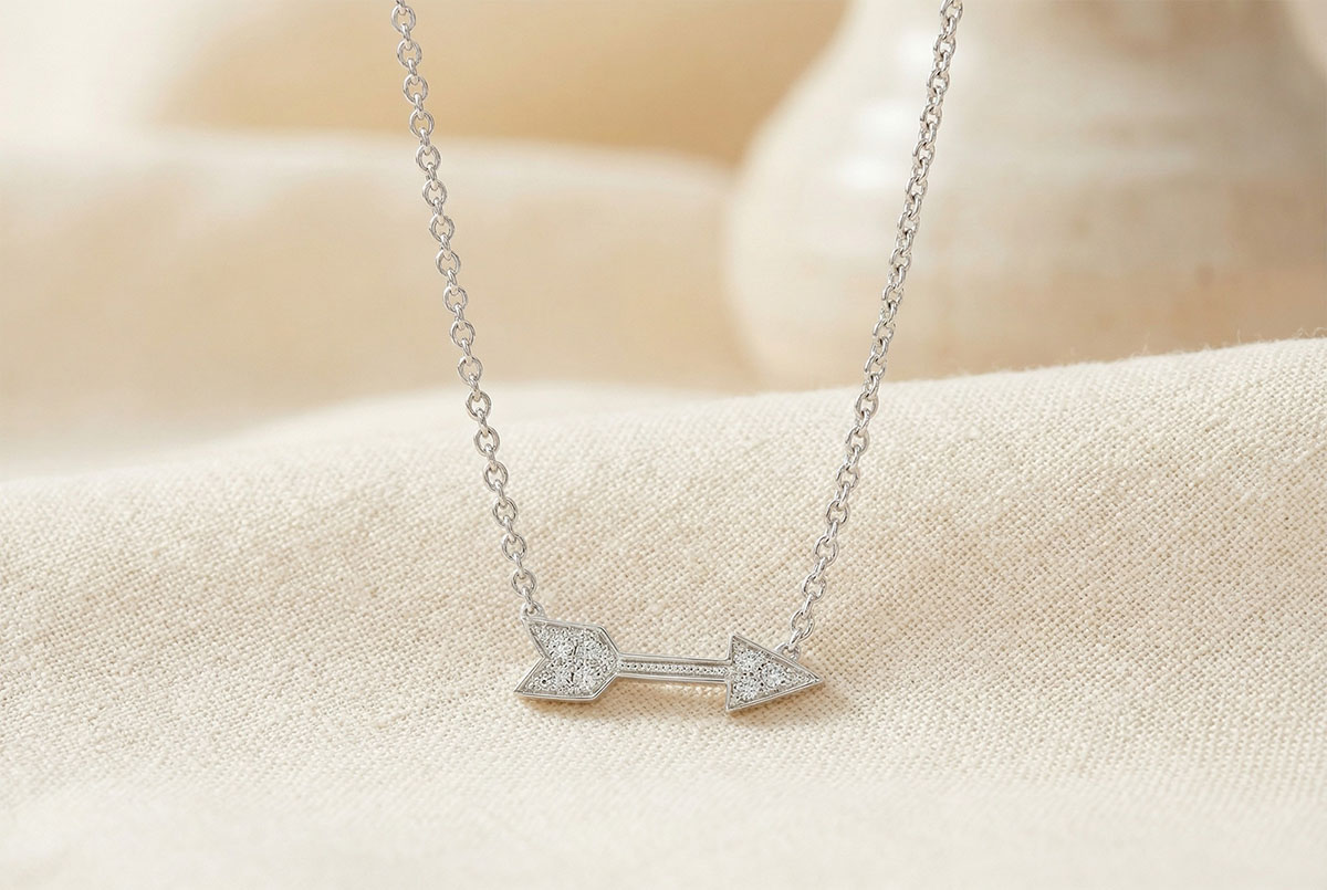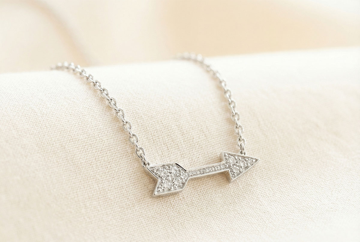 Naszyjnik z białego złota w kształcie strzały, wysadzany brylantami, prezentuje zarówno romantyczny, jak i rockowy charakter. Łańcuszek dwupozycyjny 42cm i 45cm.