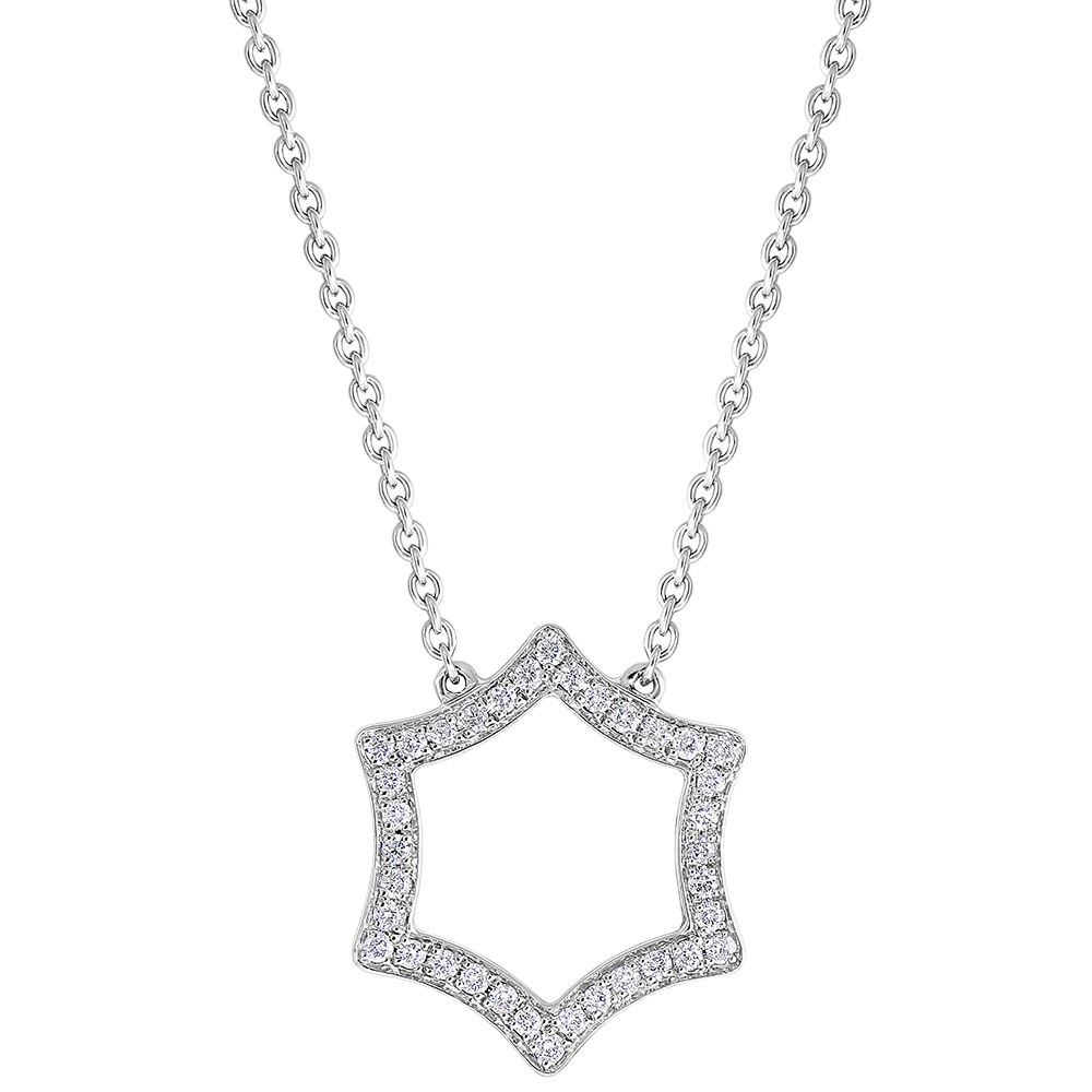 Delikatny i kobiecy naszyjnik z łańcuszkiem z białego złota ozdobionym motywem gwiazdy subtelnie wysadzanej diamentami. Łańcuszek dwupozycyjny 42cm i 45cm.