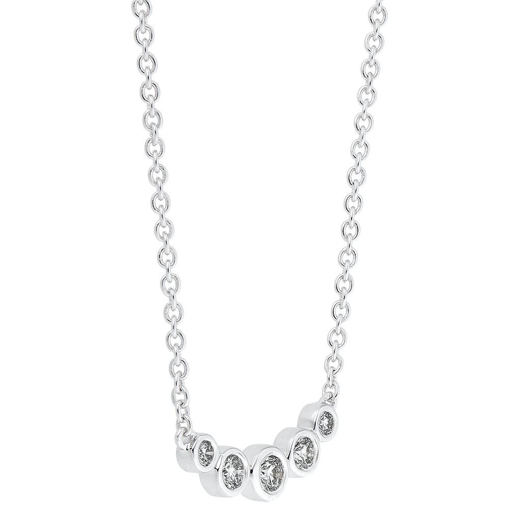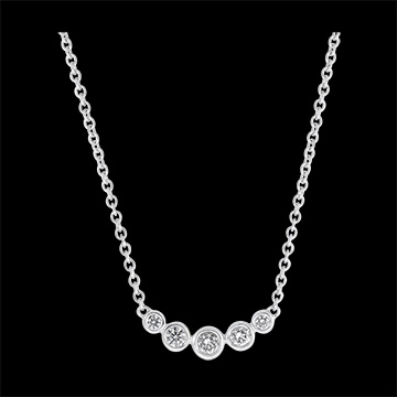 Naszyjnik z białego złota w kształcie 5 „pereł” wysadzanych diamentami w pełnej oprawie.Wyjątkowy blask powstały z inspiracji delikatnym światłem jakie odbijają krople porannej rosy. Z łańcuszkiem o długości 45cm i kółkiem do regulacji obwodu do 42cm.