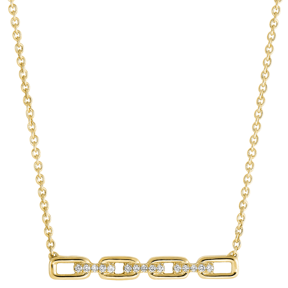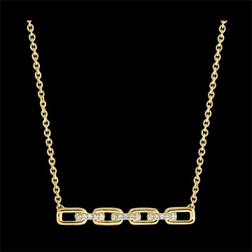 Cztery duże kubańskie ogniwa wysadzane diamentami stanowiące kontrast z delikatnym łańcuszkiem, tworzą klasyczny naszyjnik z żółtego złota w nowoczesnej odsłonie. Z łańcuszkiem o długości 45cm i kółkiem do regulacji obwodu do 42cm.