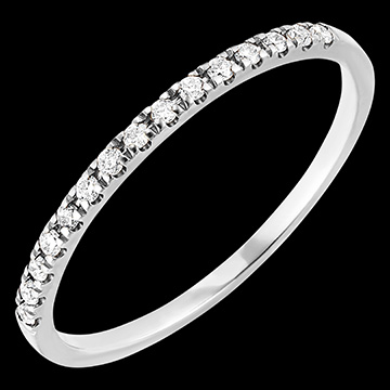 Elegancka i ponadczasowa obrączka z białego złota wysadzana subtelnymi brylantami. Doskonale prezentuje się w połączeniu z pierścionkiem zaręczynowym lub osobno.