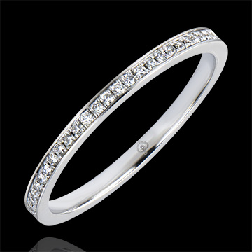 Kultowa obrączka wysadzana diamentami, która doskonale podkreśli delikatny blask pierścionka zaręczynowego.