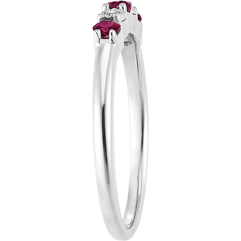 Pierścień z białego złota wysadzany rubinami i diamentami. Klasyczna, ponadczasowa biżuteria z barwnym akcentem.