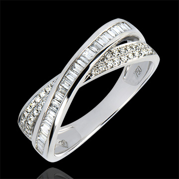 Wyważona obrączka z 2 kręgów, podkreślona diamentami o szlifie brylantowym i szlifie „bagieta”.