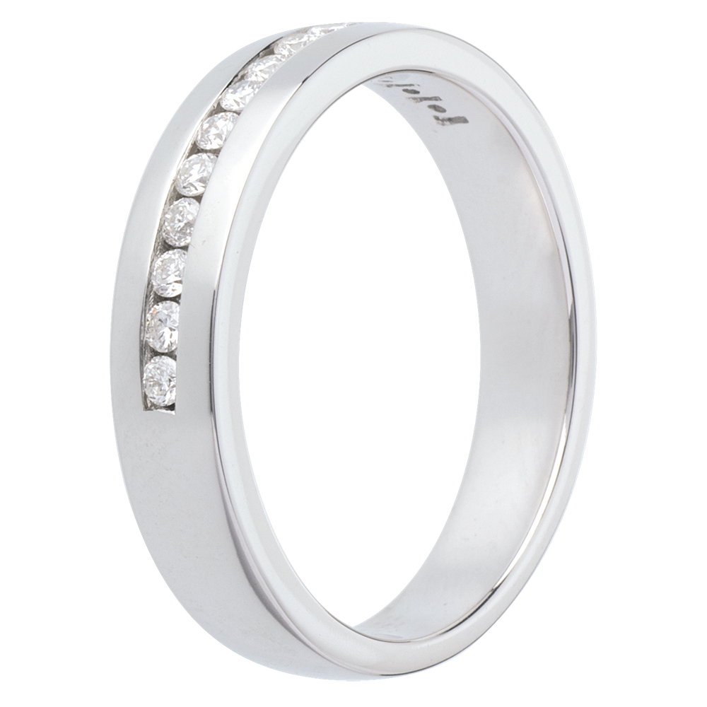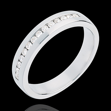 Doskonała równowaga w obrączce o wyrazistej symbolice, wysadzanej okrągłymi diamentami w oprawie kanałowej. Niezastąpiona ozdoba jako wyraz wyjątkowej więzi.