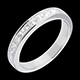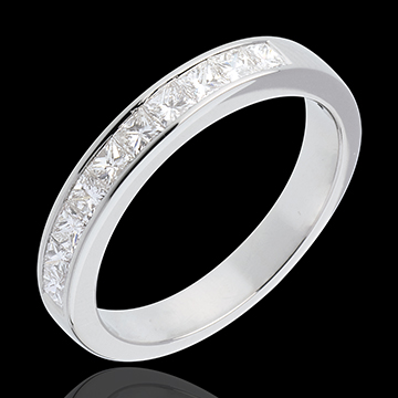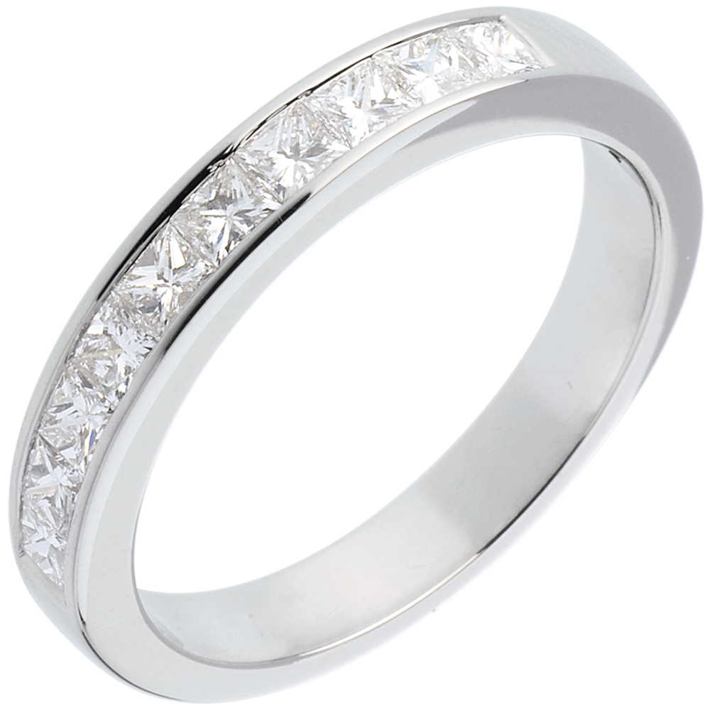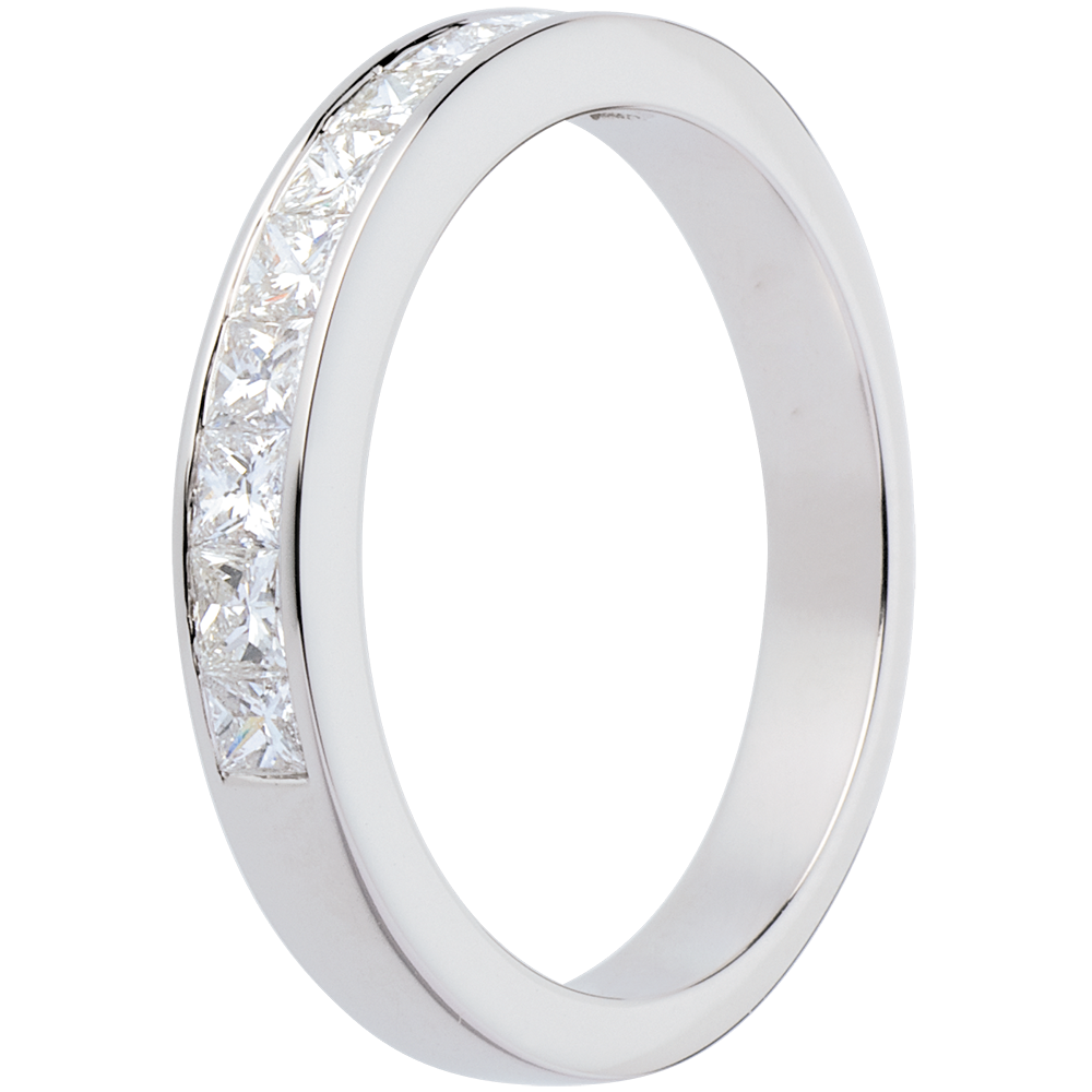 Obrączka o kwadratowym przekroju, w połowie wysadzana diamentami. Diamenty o szlifie „princessa” w oprawie kanałowej.