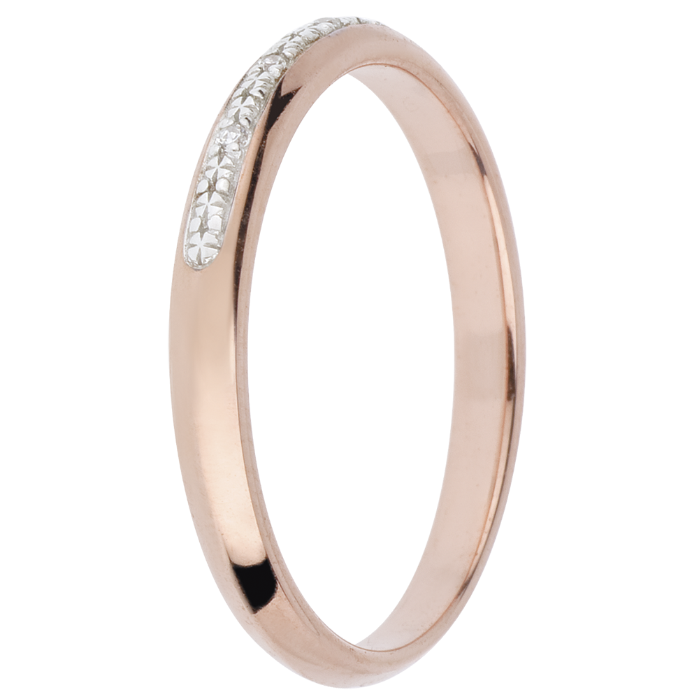 Romantyczna obrączka z różowego złota wysadzana diamentami o szlifie brylantowym.