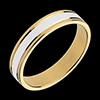 Prosta i oryginalna obrączka z żółtego złota, podkreślona na środku łukiem z białego złota.
