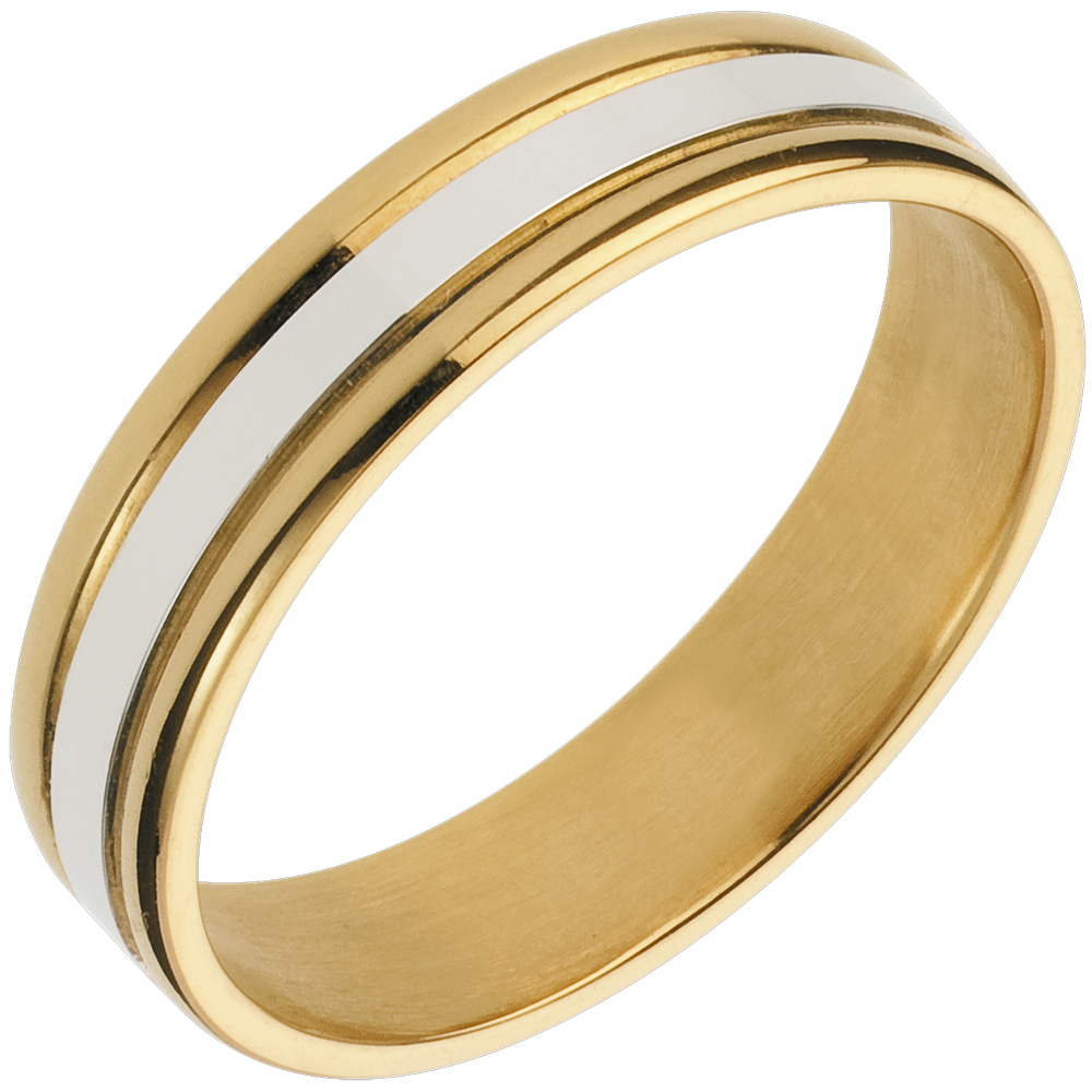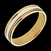 Prosta i oryginalna obrączka z żółtego złota, podkreślona na środku łukiem z białego złota.