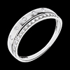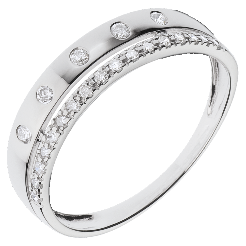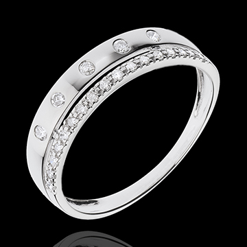 Obrączka z białego złota inkrustowana diamentami przypominającymi gwiazdy i zwieńczona obrączką wysadzaną diamentami.