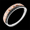 Obrączka z różowego złota inkrustowana diamentami przypominającymi gwiazdy i zwieńczona obrączką wysadzaną czarnymi diamentami.