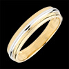 Wypukły, błyszczący złoty pierścień na obrączce z różowego złota w kształcie wstążki. Klasyka w nowoczesnym i eleganckim wydaniu.