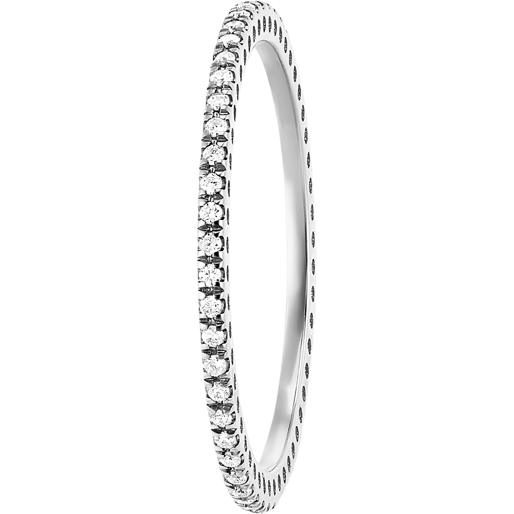 Finezyjny i subtelny pierścionek z białego złota inkrustowany diamentami na pełnym obwodzie. Doskonale prezentuje się w połączeniu z pierścionkiem zaręczynowym lub osobno.