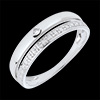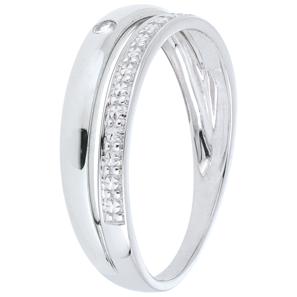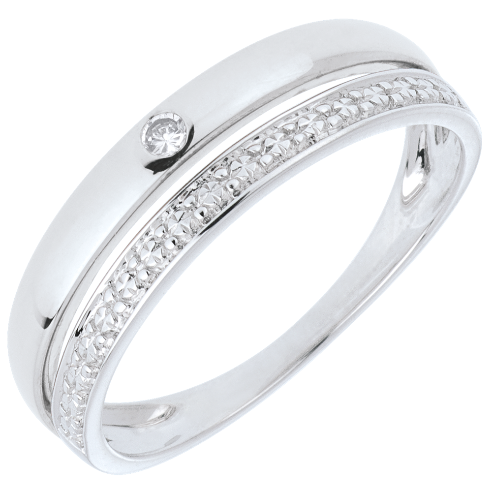Obrączka z białego złota poddana obróbce na wzór diamentów połączona z obrączką z białego złota ozdobioną jednym diamentem.