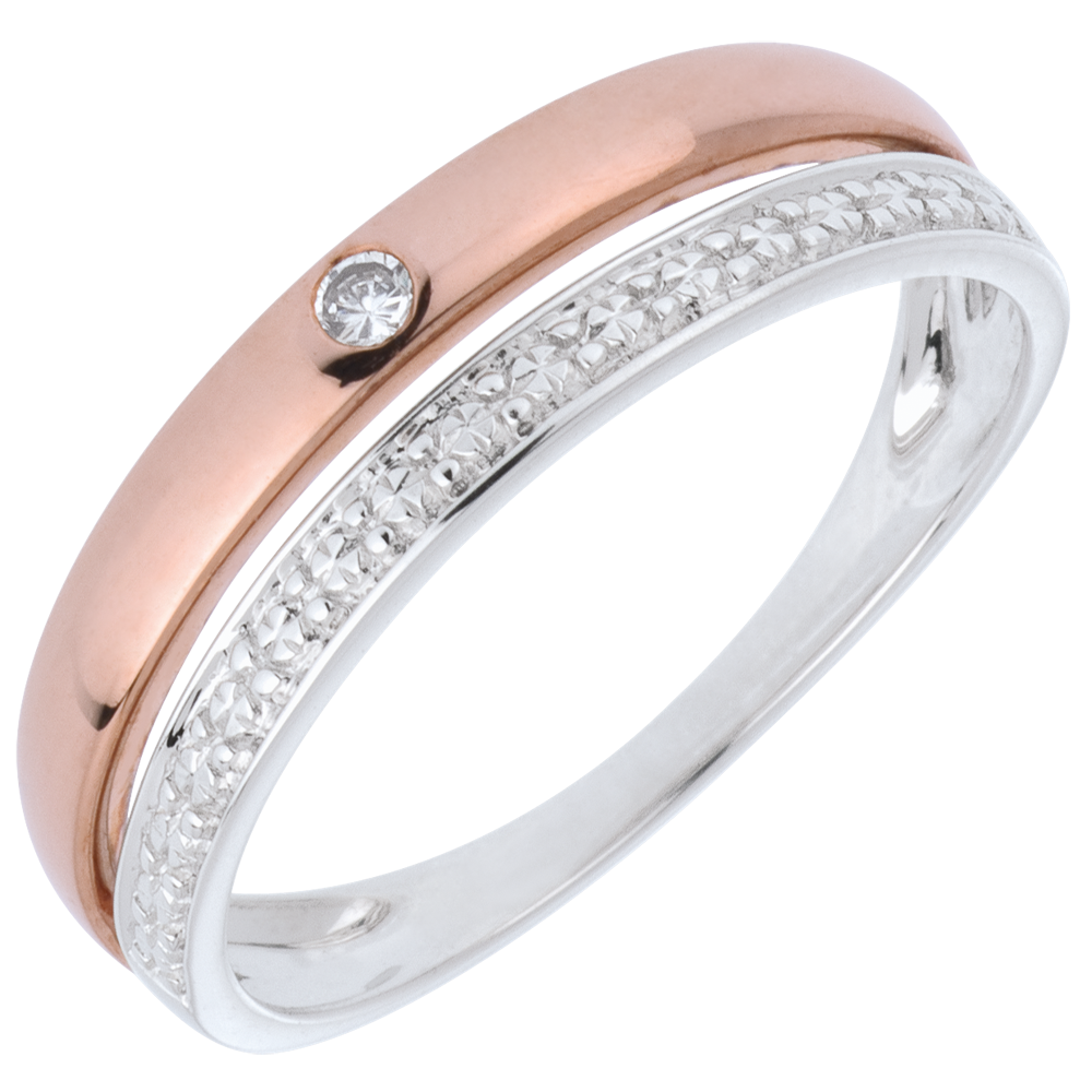Obrączka z białego złota poddana obróbce na wzór diamentów połączona z obrączką z różowego złota ozdobioną jednym diamentem.