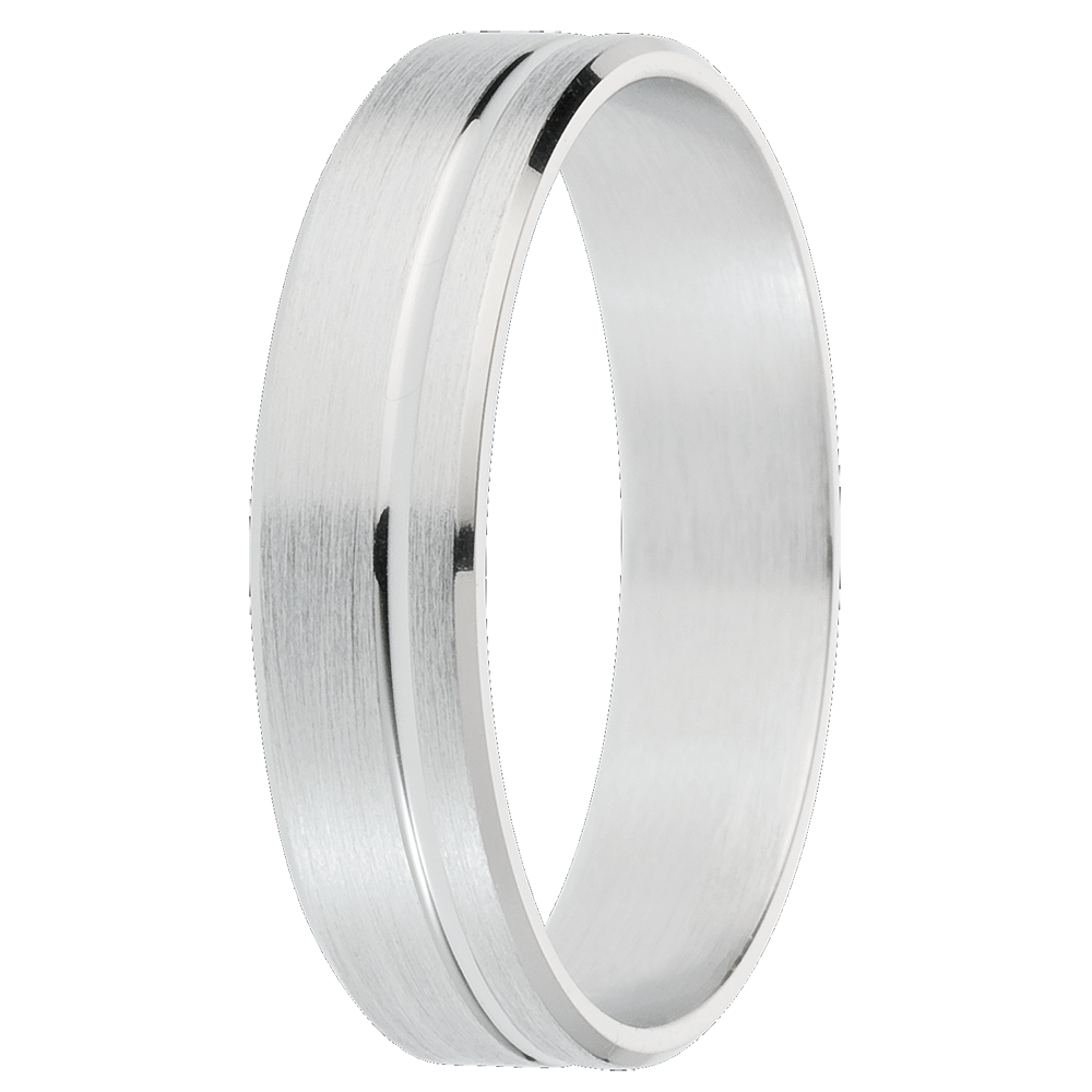 Szczotkowana obrączka z białego złota poprzecinana błyszczącymi paskami oferuje niezwykłą grę światła.