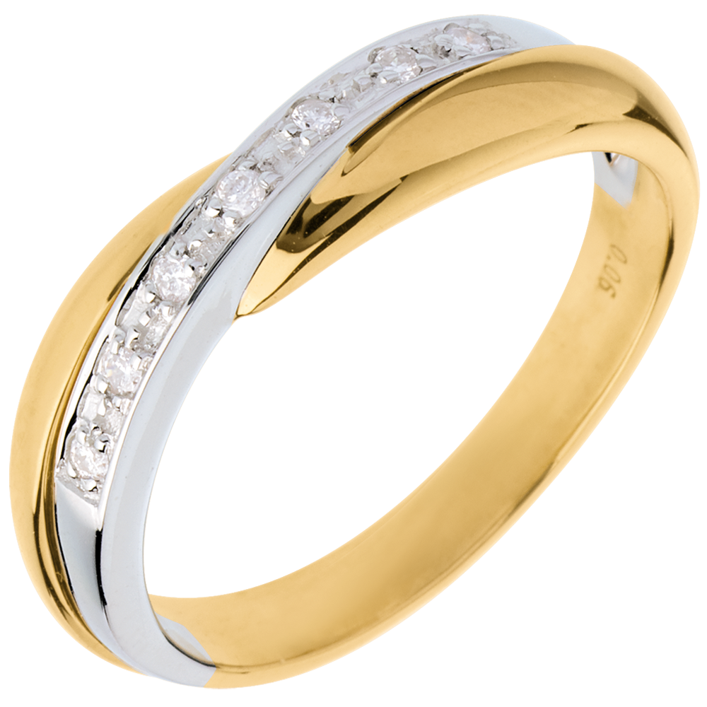 Obrączka z żółtego złota z nakładającą się obrączką z białego złota w połowie wysadzaną diamentami. Zrównoważone i harmonijne połączenie.