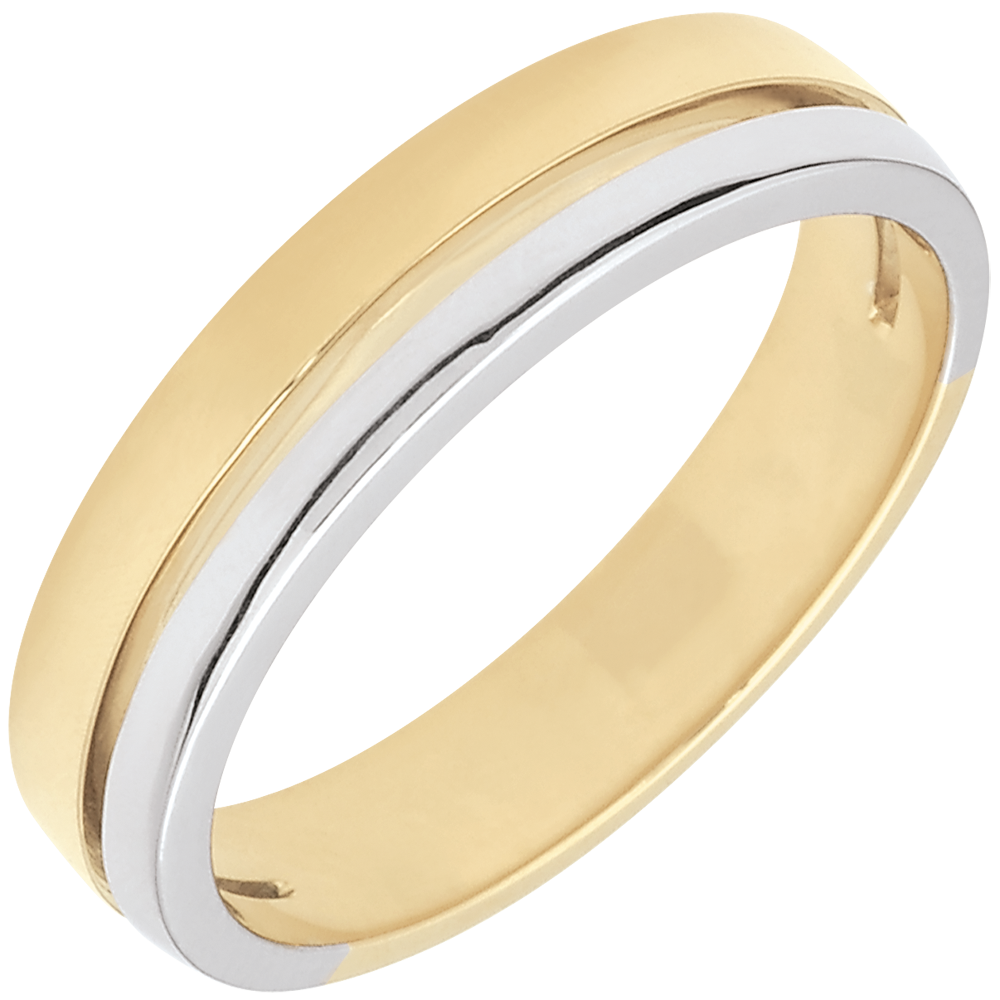 Obrączka z dwóch rodzajów złota o nowoczesnym wzornictwie dzięki odświeżającej poziomej linii.