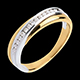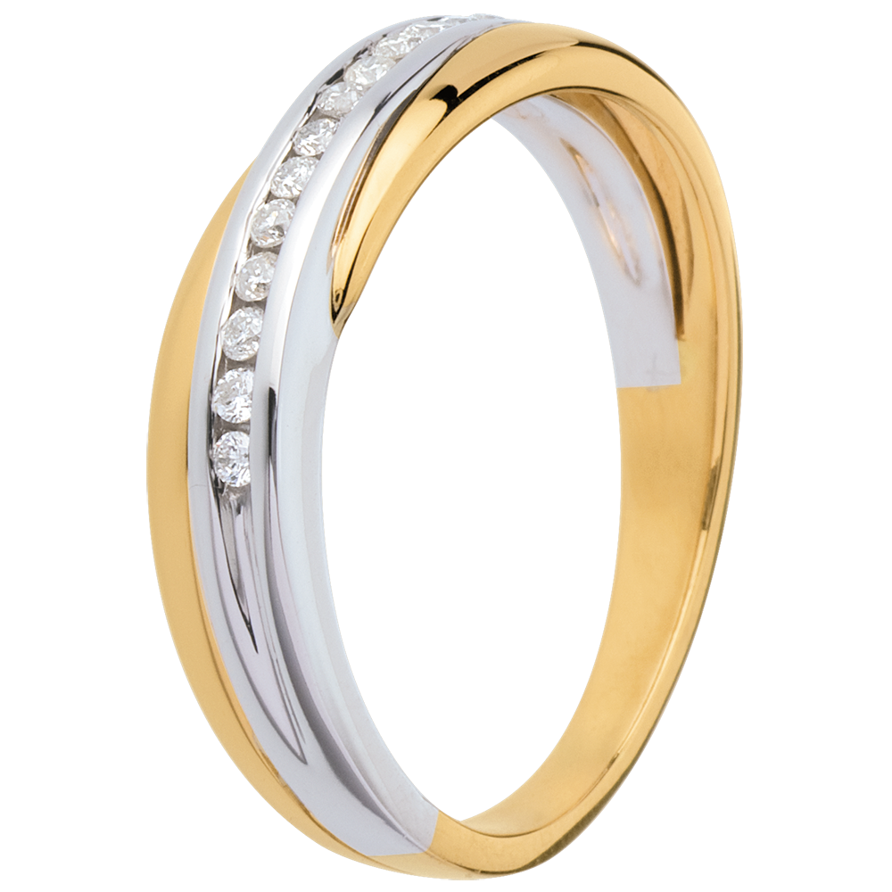 Obrączka z żółtego złota z nakładającą się obrączką z białego złota w połowie wysadzaną diamentami. Zrównoważone i harmonijne połączenie.