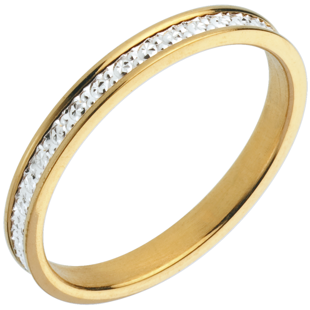 Obrączka z białego złota poddana subtelnej obróbce i zwieńczona żółtym złotem.