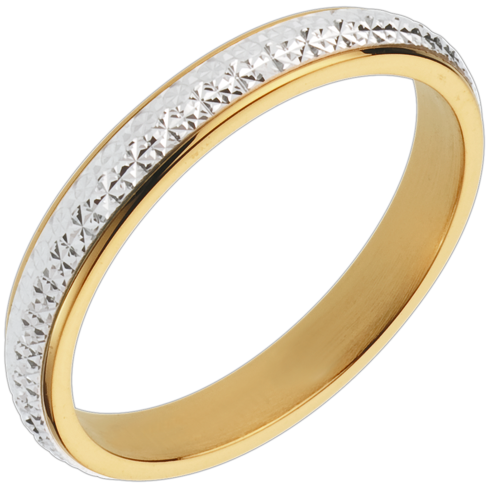 Obrączka z białego złota poddana subtelnej obróbce i zwieńczona żółtym złotem.