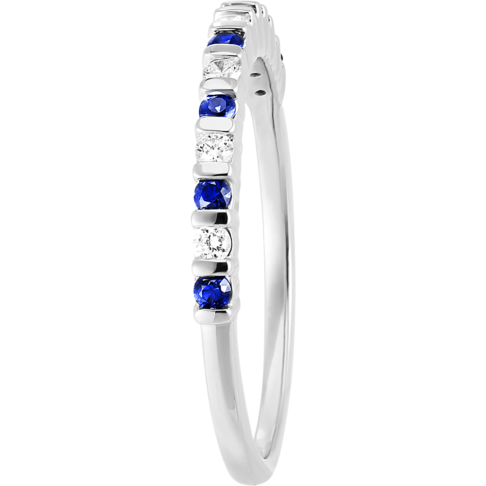 - Klasyczny design z naprzemiennym oprawieniem diamentów i szafirów