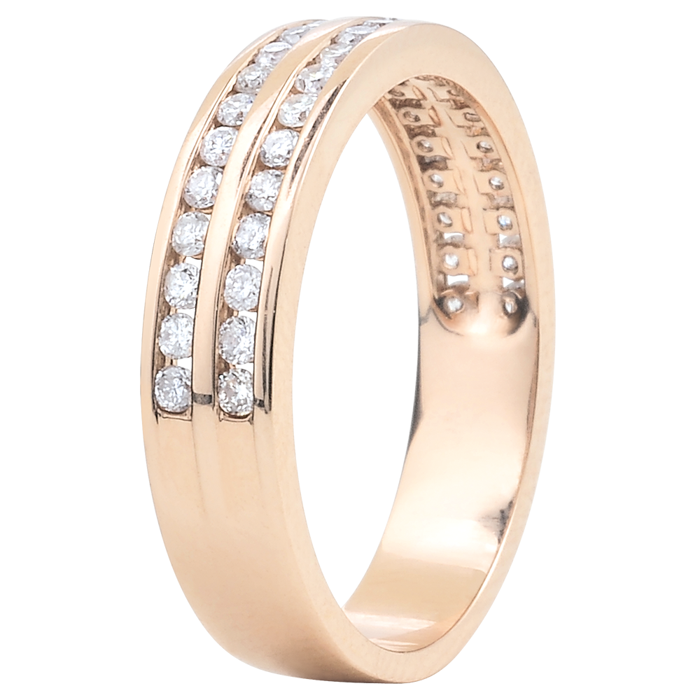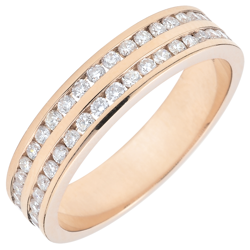 Doskonała równowaga w obrączce z różowego złota o wyrazistej symbolice, wysadzanej dwoma rzędami okrągłych diamentów w oprawie kanałowej. Niezastąpiona ozdoba jako wyraz wyjątkowej więzi.