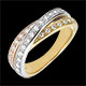 Wyważona obrączka z trzech rodzajów złota luksusowo wysadzana diamentami. Pierścionek z trzech rodzajów złota to wyrób, który może być obrączką ślubną lub wyjątkowym prezentem.